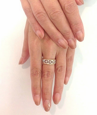 2013年10月27日 “ Jewels Party ” 雑記 11月1日から始まる6周年記念イベントを前に、スタッフの寺沢がネイルサロンに。今回のジェルネイルカラーは “Jewels Party”イベントのイメージからアンティーク調のヌーディーカラーにストーンがキラリ。大好きなLace Ringを着けて準備万端です。さてと私もそろそろ準備を始めましょうか。 “Jewels Party” 11/1〜5 寺沢のお気に入りはK18WGとPGコンビのLace Ring
