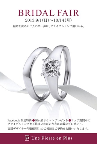 9月1日(日)〜10/14(月)、ブライダルフェアを開催いたします。当サロンのオーダーブライダルから人気のセミオーダーマリッジリングまで、この機会に是非お手にとってお確かめください。ご来店をお待ちしています。