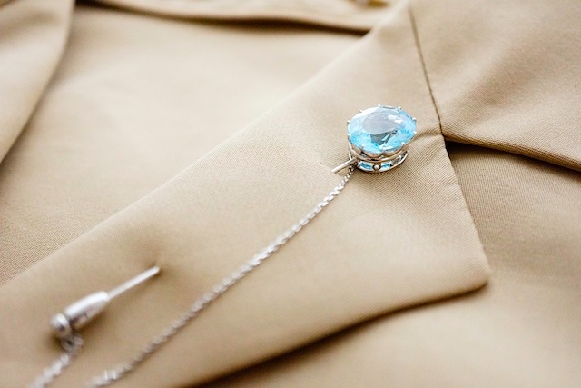 今、お洒落なジュエリーと言えばピンブローチです。今では使わなくなった思い出のリングをリ・スタイルしてピンブローチに変身させてみてはいかがでしょうか!鮮やかな空色をしたブルートパーズ。存在感のあるボリュームに相応しく、クラウンタイプの爪座にセッティングしました。サイドのデザインにもこだわったピンブローチが出来上がりました。