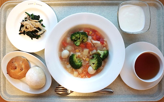 四谷メディカルキューブという病院で出される病院食(写真は常食用)が凄いのです。同ビル7Fにある日本で初めて料理人が監修した院内レストラン「ミクニ・マンスール」が作る病院食は、フランス料理の三國清三シェフがプロデュースするマンスール食です。