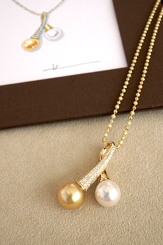 「お気に入りだった白蝶パールリングと、壊れてしまったゴールデンパールのペンダントふたつを合わせてひとつのペンダントにしてみたい。」イメージに近いペンダントの写真をお持ちになってのご相談でした。両方に付いていたメレダイヤを全て使って、ゴージャスで躍動感のあるペンダントが出来上がりました。