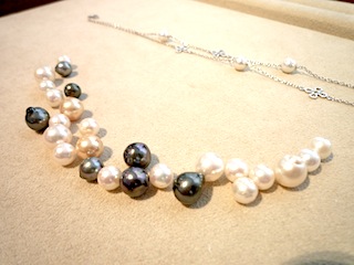 昨年末、南洋パールのロングネックレスを三連ドッグカラーにリ・スタイルされたM様。その時の余りのパールを使ってとっても素敵なブレスレットが出来上がりました。珠のサイズと形状、そして色味を考えてバランスよく配置。M様の身体の動きに添って豊かな表情を見せてくれるブレスレットになりました。