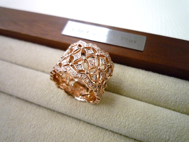 昨年私がオーダーした、アンティークレースをモチーフにしたリング。「レースの繊細なイメージを損なわず、かといって華奢過ぎず、余り重さを感じさせないデザイン・・・」などなど、私のわがままを全て叶えた"Lace Ring" です。