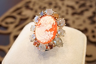 アースカラーのダイヤモンドを敢えてラフカットで仕上げ、オレンジのカメオと共にホワイトゴールドにセッティング。絶妙な色合わせと趣が「MATTIOLI」ならではの逸品です。