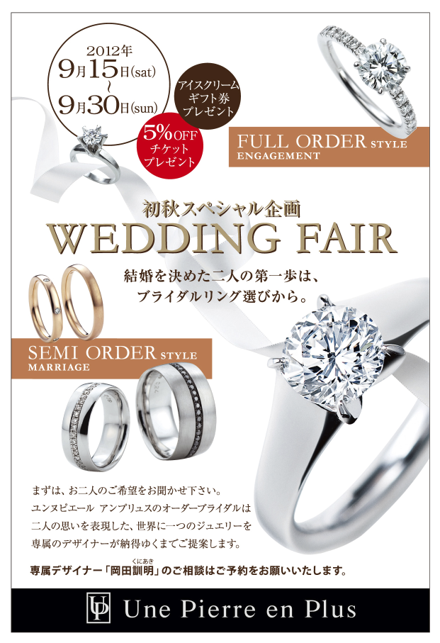 ユンヌピエールアンプリュスでは、9/15〜9/30の期間中「WEDDING FAIR」を開催いたします。期間中ご来店の方へ5%OFFチケット&アイスクリームギフト券をプレゼント!「まずは、お二人のご希望をお聞かせ下さい。」デザイナー岡田訓明がお二人の夢や憧れを形にするお手伝いをいたします。