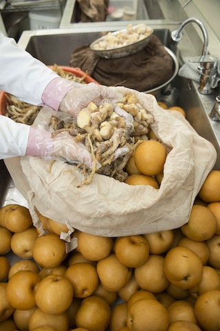 先日ご紹介した、喉に優しい「ogada呼茶」。韓国ogadaから仕込みの写真が届きました。採り立ての新鮮な梨と生姜。根のように見えるのはキキョウの根、韓国では「ドラジ」と言います。ドラジは風邪の咳や喉の痛みを和らいでくれる効果があるのです。これらの材料で釜煮出しされてる「呼茶」。ほんのり梨の甘みとスッキリとした飲み口が私の一押しです!