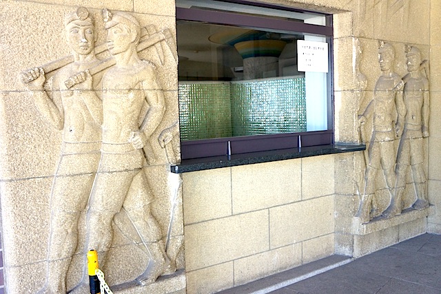 玄関サイド壁面:炭都の象徴「鉱夫のレリーフ」 |