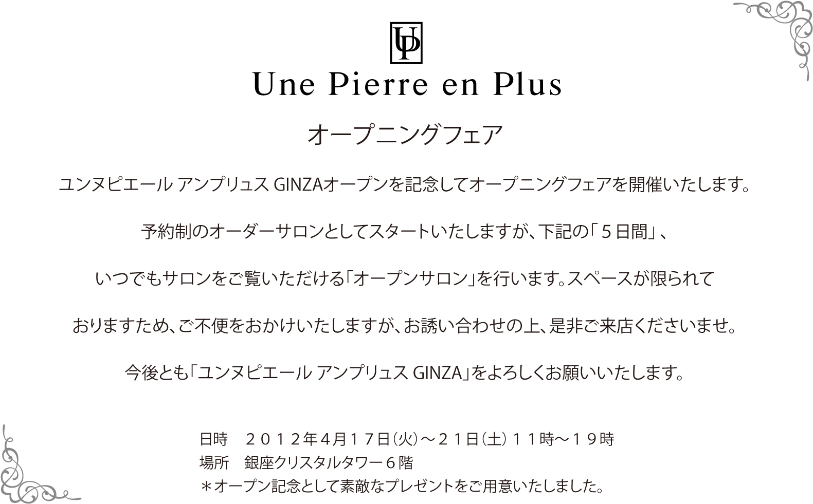 本日、表参道のコンセプトを引き継いだ「ユンヌピエールアンプリュスGINZA」がオープンいたしました!! "ジュエリースタイルを創造するオーダーサロン" です。今が旬の銀座並木通りと柳通りの交差点にそびえ立つ銀座クリスタルタワー6F。(1Fは、J.FERRYレディース)こちらのサロンでは私に代わって、チーフデザイナーの岡田訓明と、ジュエリースタイリングプロデューサーの松本みさ。そして我らが稲葉光則が、皆様をお迎えいたします。
