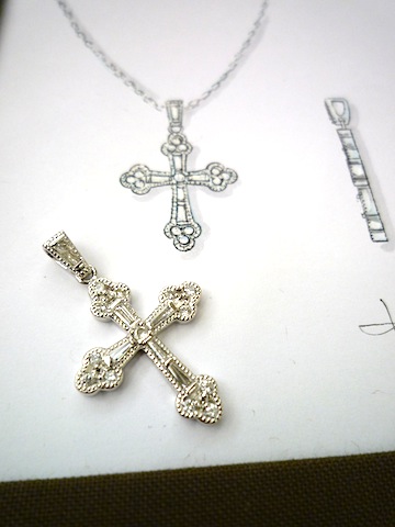 最初のイメージでは、ただ石を並べてクロスの形にしただけのものでしたが、 アンティーク調にも出来ますか?とのご要望にお応えして、想像以上に完成度の高いペンダントヘッドが出来上がりました!