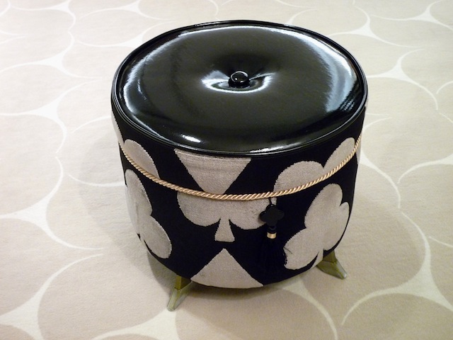 英国アンドリューマーチン社製のトランプ柄が小粋な「ファーストチェア・フェロニエ × ユンヌ ピエール アン プリュス」ダブルネームの「アルジーヌ」。座面は黒のエナメルに、オニキスのクローバータッセルが素敵。遊び心をふんだんに散りばめた大人のミニスツールの完成です。