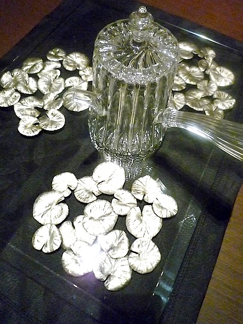 ポットスタンドの上にガラスプレートをのせた涼しげな演出 |