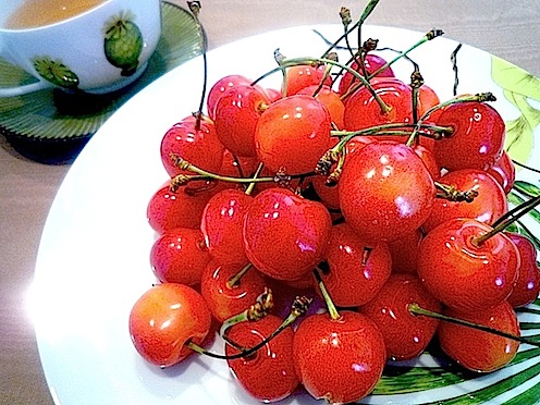 2011年07月04日 佐藤錦 雑記 産地直送の佐藤錦が届きました。バラ詰めとは言えとても高価なサクランボ。今年のは大きくて甘くってぷりぷりの幸せな味。ザブっと洗ってぱくぱくとそのままいただくのが鉄板。カリウムやカロチンが多く含まれてて、鉄分豊富。疲労回復・貧血・美肌に効果アリ!サクランボヴェールのお茶と共にいただきま〜す。癒しのひととき♪ お気に入りのリモージュのお皿に大盛りで