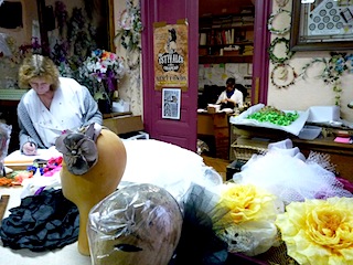本物より艶やかなお花がいっぱい。奥の工房で手仕事中。