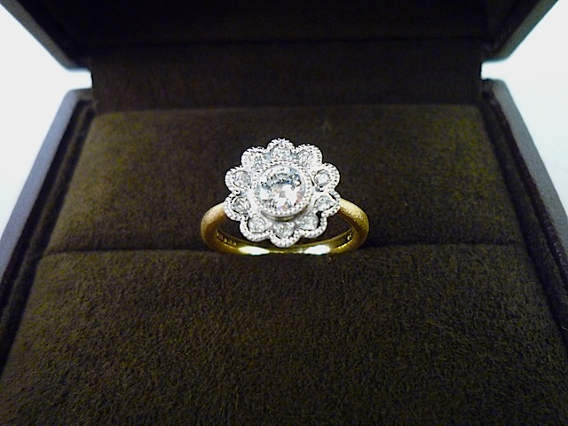 2010年12月14日 アンティーク調お花モチーフ Re-Styleダイヤモンドリング アンティーク調のお花のモチーフに、艶消しの腕がモダンな印象を与えるリングが出来上がりました。 お母様のダイヤモンドプチペンダント&リングから、お嬢様の可愛らしいリングへ大変身リ・スタイル。 花弁に施されたミル打ちがクラシカルさを強調。 before