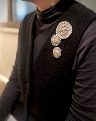 昔お気に入りだったPRADAのカーディガンに素敵なブローチが縫い付けられていて、長年そのままになっていました。団欒タイムに相談をしてみたところ、カーディガンからブローチを外し、新しい命を吹き込んでいただくことに。「リメイクも承ります」という心強いお言葉をいただきました。大切に仕舞っておいたブローチがプロの手によって再び輝き出す。そのプロセスもまた、モノづくりの醍醐味で興味シンシンです。