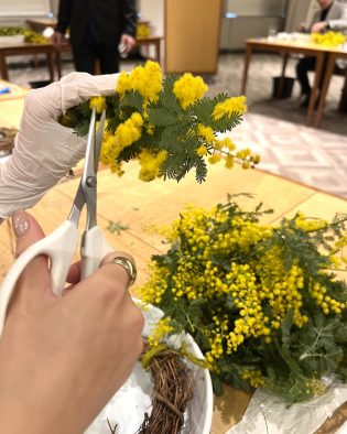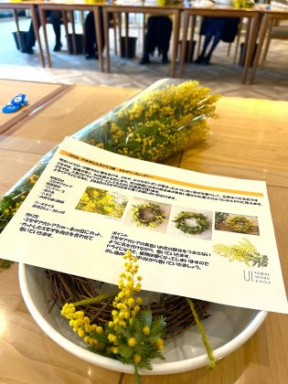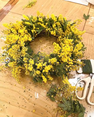 先日、次男のお嫁さんと一緒に、春の訪れを告げる「ミモザリース」のワークショップへ出かけてきました。2月から3月にかけて見頃を迎えるミモザは、見ているだけで心が弾む「幸せの花」。イタリアでは男性から女性へ感謝を込めて贈られたり、3月8日の「国際女性デー」のシンボルだったりと、日本でもすっかり春の定番になってきましたね。あの鮮やかな黄色は、眺めているだけでふしぎと元気が湧いてきます。最近は少し握力が落ちてしまい、ワイヤーを使う作業に不安もありましたが、先生の丁寧な導きのもと、お花やグリーンのバランスをじっくりと見つめる贅沢なひとときを過ごしました。一編みごとに心を込めて、黙々と仕上げたリース。ふわっと優しい黄色に包まれて、サロンにも、ひと足早く温かな春がやってきました。