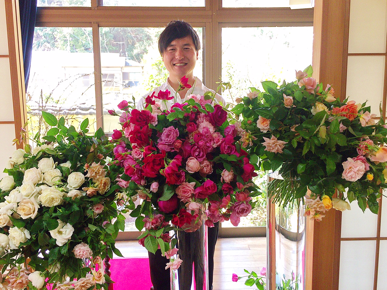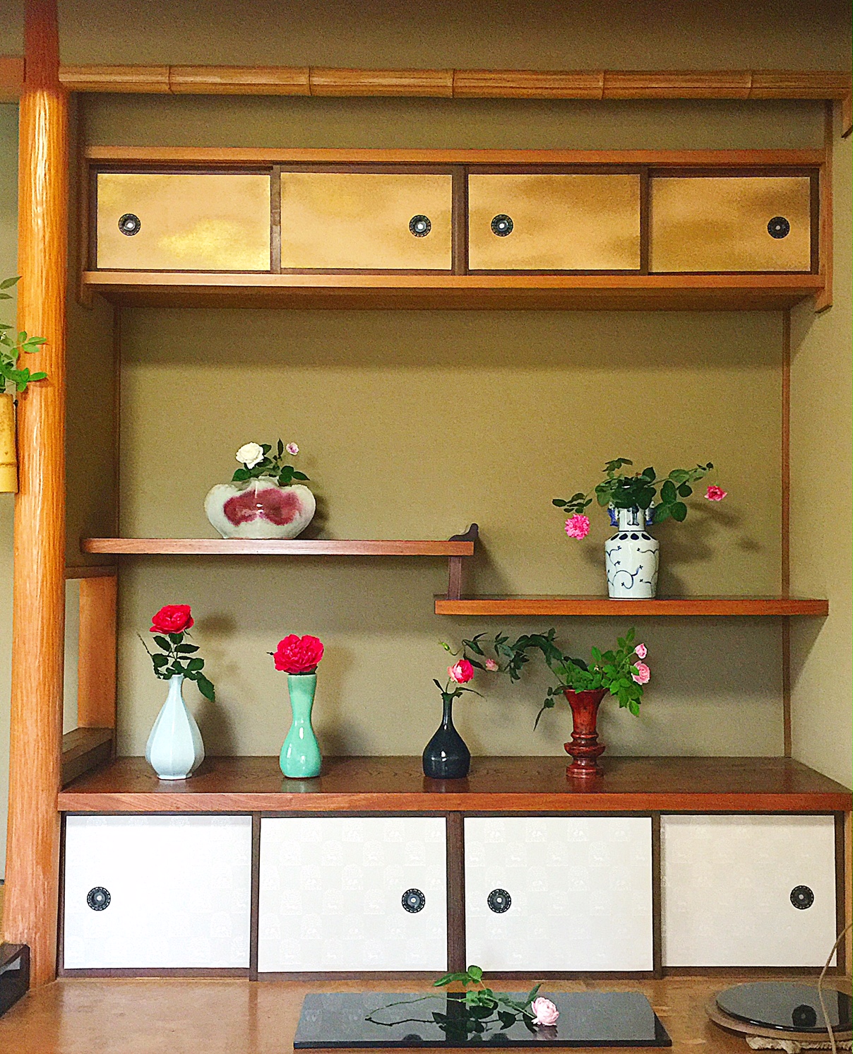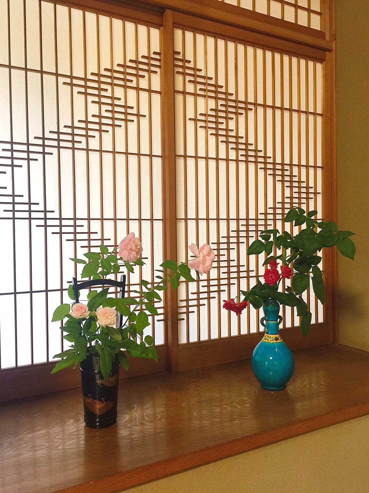 井筒庵の様々な花器に健一氏が イメージする和ばらを活け込んで |