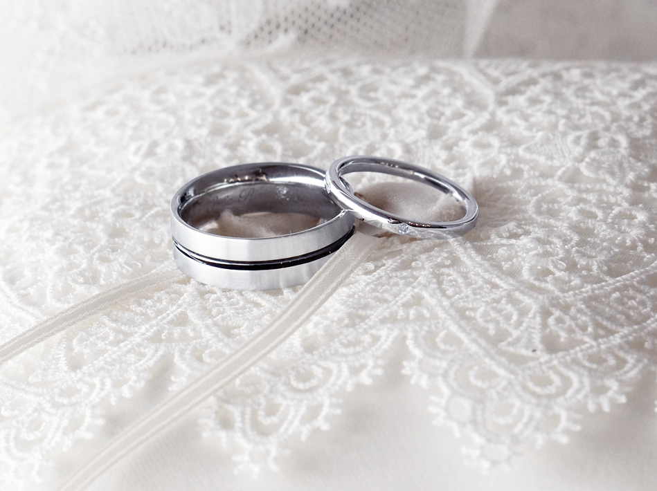 お母様の想い出のジュエリーを使って、エンゲージリングとマリッジリングを作りたいとのご相談をいただきました。エンゲージリングは、当サロンオリジナルのソリテールリングを参考に、センターダイヤモンドを支える爪の根元にピンクゴールドの小さなリングを巻き、お母様のメレダイヤモンドを配した愛らしいデザインになりました。残ったメレダイヤモンドは、お二人それぞれのマリッジリングへと受け継がれました。