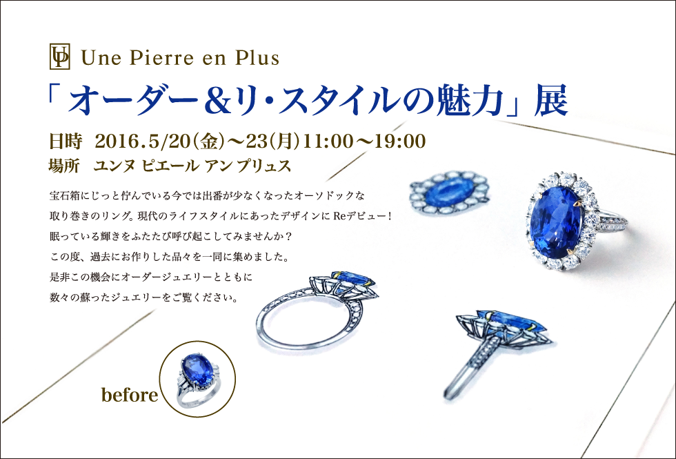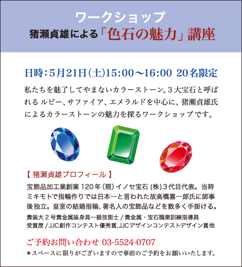 『オーダー&リ・スタイルの魅力』展を開催します。期間中、過去にお作りしたオーダー&リ・スタイルジュエリーの品々を一同にご覧いただけます。パーツをお好みでカスタマイズしていただけるセミオーダースタイルのオリジナルネックレスも新登場!ワークショップでは猪瀬貞雄氏による「色石の魅力」講座も開催します。ご興味のある方はこの機会に是非!皆様のお越しを心よりお待ちしています。