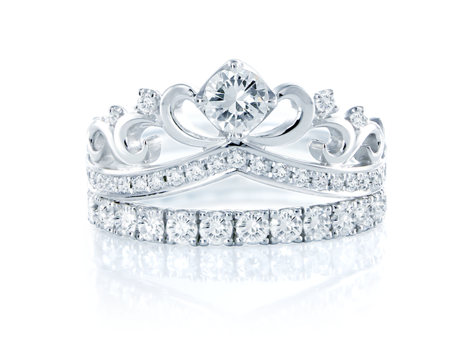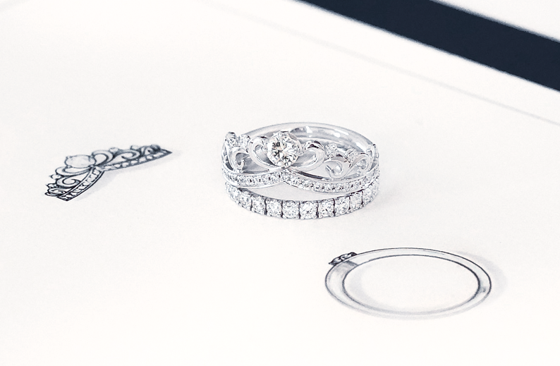 お母様から譲り受けた想い出のダイヤモンドをセンターに配して、長年憧れのティアラモチーフのリングが完成しました。「結婚指輪やフルエタニティと重ね着けて色々楽しめますね!母といつも一緒にいるようで嬉しいです。」とてもお似合いのM様でした。