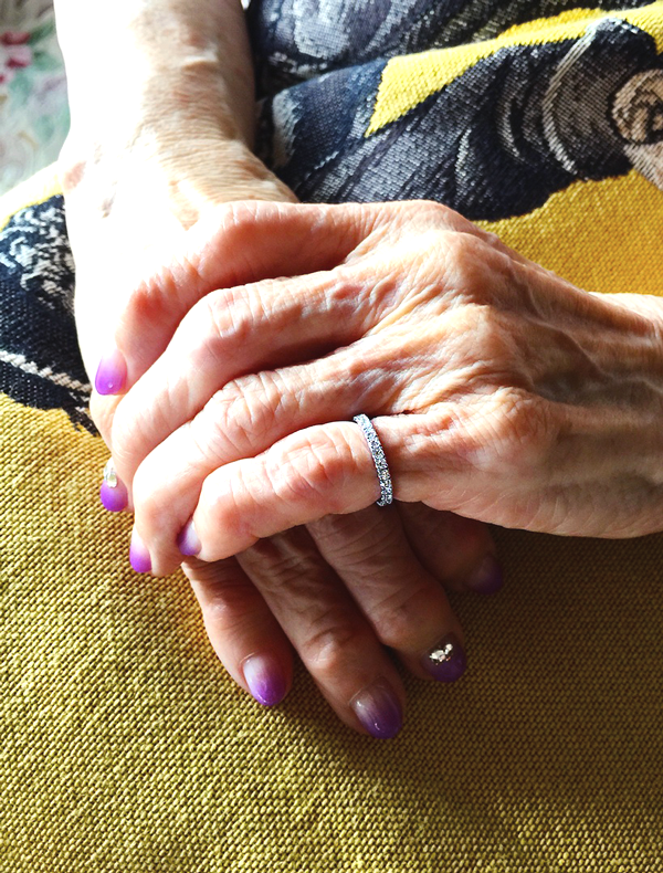 映画「アドバンスト・スタイル」に出てくるNYマダムのようにエキサイティングな日々を送ってる訳でないけれど、地方のデイサービスの施設では間違いなくファッションリーダーのお洒落な母です。念願のフルエタニティピンキーリングが出来上がって大満足!「一本では物足りないから2本、3本と重ね着けして楽しむわね。」これぞ元気の源でしょうね。