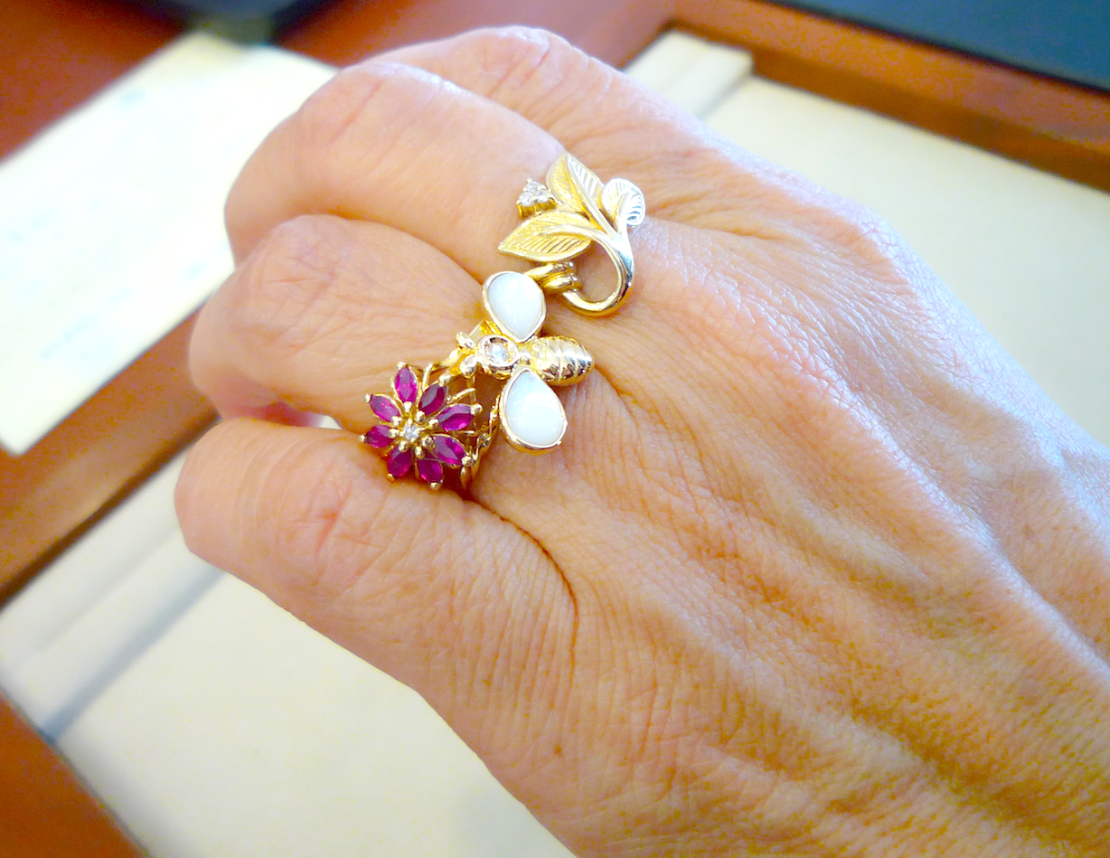 お持ちのリング2本とリスタイルしたミツバチのリングを重ねて着けたところの写真