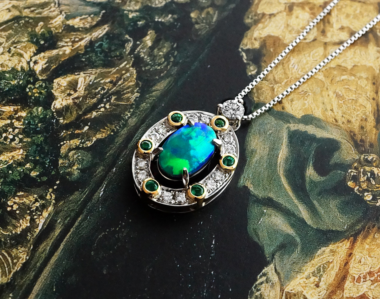 オパール、エメラルド、ダイヤモンドを使ってリスタイルしたペンダントを斜めから撮った写真