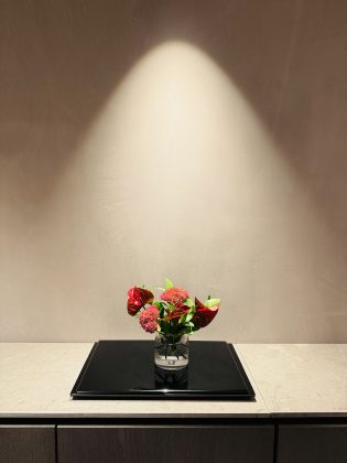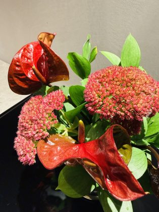 中秋の季節がやってきて、やっとやっと気温も落ち着きそうな気配がしてきました。今回のサロンのお花はとても珍しい色の“アンスリウム”。海外産が多い種類の中、珍しい国内産の小ぶりの“アンスリウム”、色がシックで秋色でなんともいえませんね。同系色の“ルベラ(ミヤマシキミ)”を添えました。