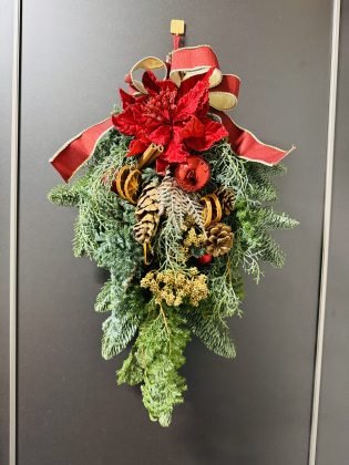 今年は玄関には先日参加したワークショップでスワッグを作りました。“もみの木”“ヒムロスギ”“ブルーバード”“ブルーアイス”4種のグリーンのコントラスが素敵な花材でした。いよいよ明日はクリスマスイブですね。“Merry Christmas!!”素敵なクリスマスのお時間をお過ごしください。