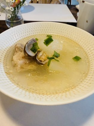 この日のスペシャルモーニングメニューは、①3種の「蟹殻黄」蟹の甲羅の様な形の天心、②アサリと冬瓜のスープ、③タロイモと蓮の実のお汁粉、④台湾茶(梨山高山茶)台湾のお茶を飲みながらモーニングコースをいただきました。