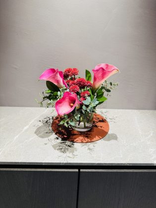 サロンのお花は、大ぶりのワイン色のカラーとスプレイギク。グリーンはアロマの香りのユーカリと緑色が鮮やかなルスカス。