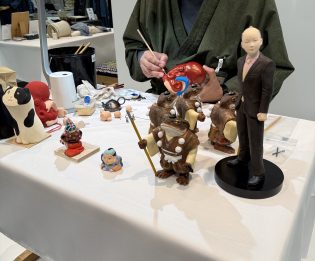 今回特に気になっていたのはとてもインパクトあるビジュアルの蛙人形、ちょうど作家の方が実演中でお話もお伺いしました。博多人形の作家の方で、博多人形伝統工芸士小副川太郎氏の造られる博多人形は私が幼少時代からよく知る着物を着て踊る美しい女性の博多人形とはかなり違う世界観の作品で、キャラクターが生き生きとしてとても素敵な作品でした。蛙人形「※宝満山の蛙」は松屋銀座のイベントビジュアルにもしっかり使用されていました。プライドを持って日々仕事と格闘している髷を結ったサラリーマンも印象に残りました。