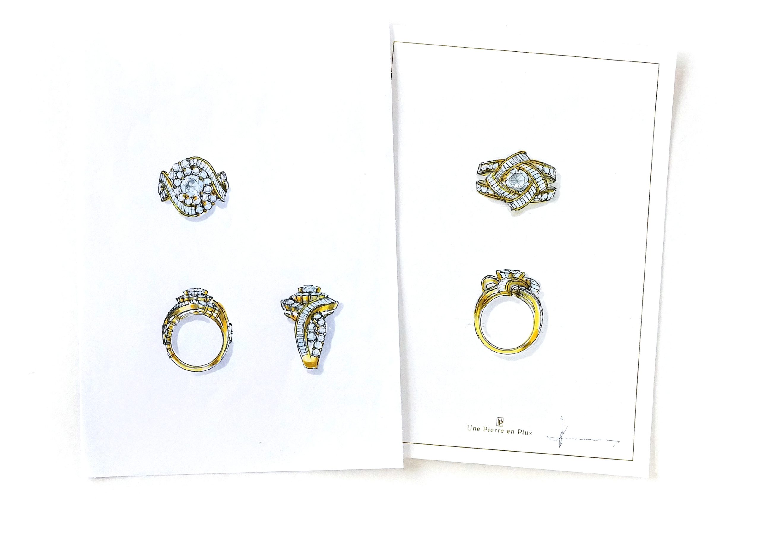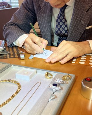 O様はいつも「元のジュエリーに付いている石をすべて使い切ってほしい」とおっしゃいます。そのためデザインの難易度は高まりますが、今回も一石も無駄にすることなく仕上げました。