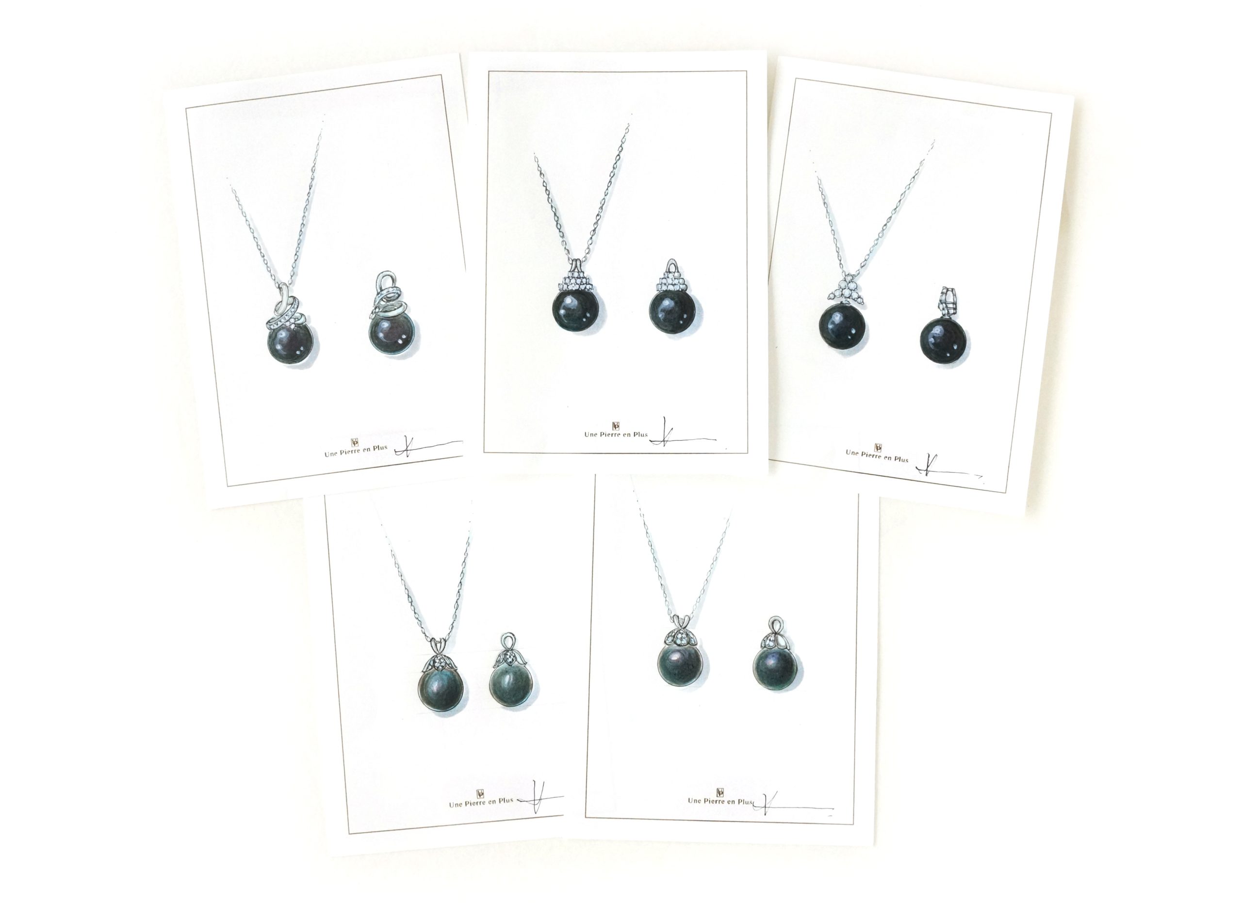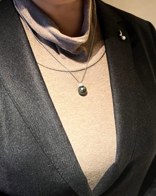多彩な色が揺らめく大粒の黒蝶真珠ペンダントは、もともとオメガチェーンに付いていたそうですが、細いチェーンには馴染まないため、デザインを変えたいとのご相談をいただきました。H様からは「この黒蝶真珠を、手持ちのリングとセットで楽しめるデザインにしたい。以前リスタイルした“小茄子ちゃん”(可愛い愛称ですよね)とは違う雰囲気にしたい」とのお話とともに、写真をお送りいただきました。